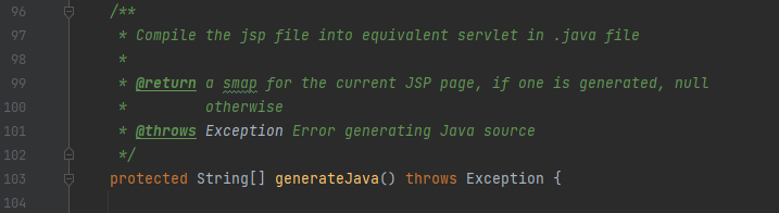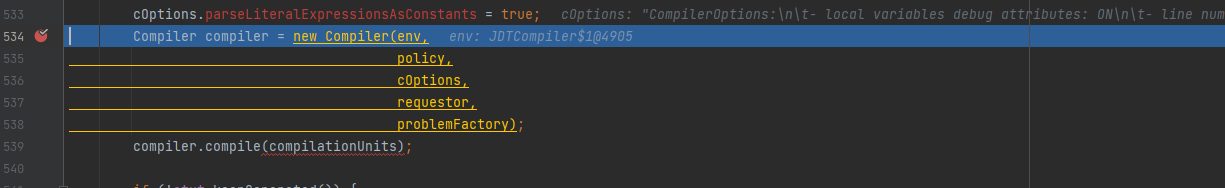 跟进,上面提到过我们使用的Compiler 是默认的JDTCompiler,该类重写了generateClass方法,所以我们来到org.apache.jasper.compiler.JDTCompiler 的generateClass方法,宏观上看这里其实就是要实现编译过程,调试跟入该方法,我们会看大一堆设置和判断操作,jvm判断等为编译做准备,编译的关键代码如下: