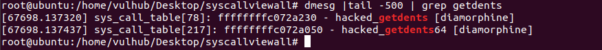 如下图,通过加载我们自己的内核模块开展排查(上文遍历syscalltable的内核模块),我们可以看到,此时系统调用getdents是被diamorphine劫持了: