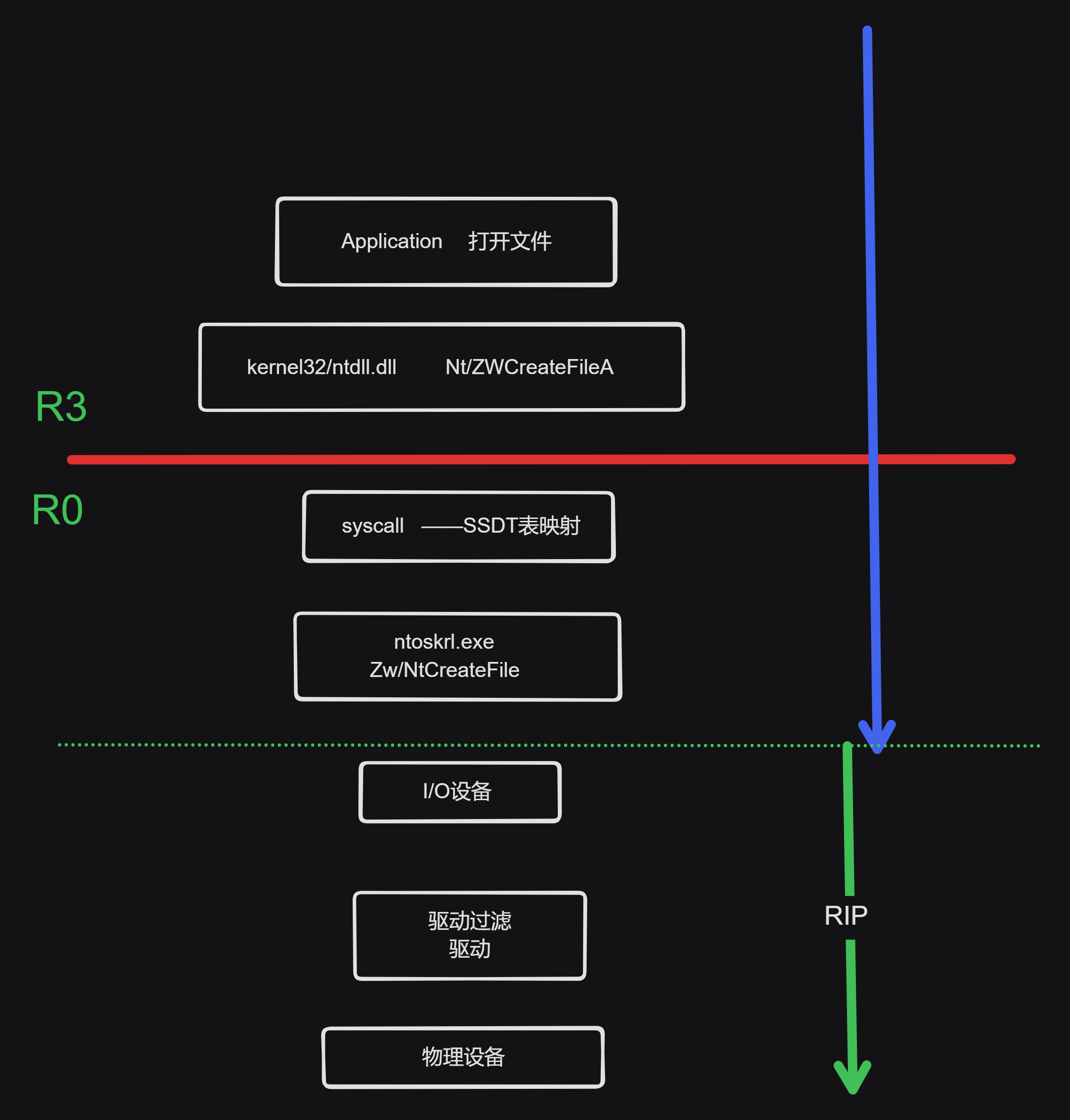 如下图是windows的应用层api调用,内核调用情况,可以看到,rip传递到驱动以及更底层的物理设备之前是先要经过过滤驱动的,通过在这里实现文件过滤驱动,匹配特殊的rip信号形式,比如:IRP_MN_QUERY_DIRECTORY\IRP_MJ_DIRECTORY_CONTROL之类的,从而对其特殊处理,实现文件隐藏;